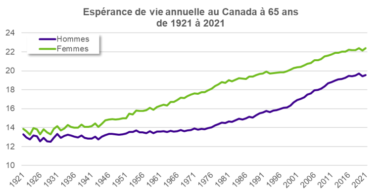 Le graphique ci-dessous illustre l’espérance de vie annuelle au Canada à 65 ans entre 1921 et 2021 pour les hommes (en pourpre) et les femmes (en vert). Même si l'espérance de vie des hommes et des femmes a augmenté sur une période de 100 ans, il est important de souligner que le taux de cette augmentation, et parfois le moment où elle s'est produite, variait entre les hommes et les femmes.