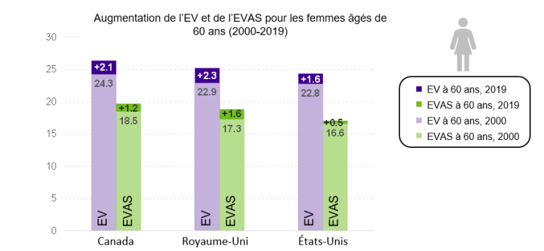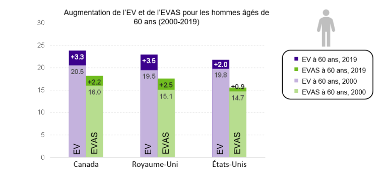 L’augmentation de l’EVAS entre 2000 et 2019 était plus faible que l’augmentation de l’EV pour les hommes et les femmes dans l’ensemble des trois pays. Par conséquent, nous remarquons une tendance cohérente de gens vivant plus longtemps, mais passant plus de temps à la fin de leur vie en mauvaise santé.