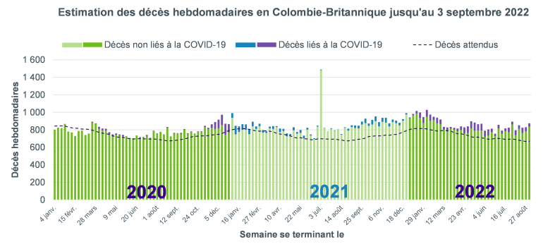 L'analyse de données plus récentes, disponibles seulement pour certaines provinces, suggère que la mortalité à partir de la fin du printemps 2022 sera probablement semblable à celle de la seconde moitié de 2021. Le graphique de la Colombie-Britannique (graphique du bas) est probablement le meilleur exemple illustrant à la fois les niveaux élevés de mortalité vers la fin 2021 et un retour à une surmortalité pendant l'été 2022. La surmortalité au courant de l'été 2022 est également évidente en Alberta et au Québec.