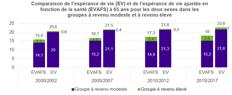 Le récent débat sur le report de l’âge de la retraite dans le monde (au Canada, au Royaume-Uni, aux États-Unis et en France, par exemple) mettait l’accent sur la hausse de l’espérance de vie depuis la mise en place des dispositions d’État relatives à la retraite2. Toutefois, l’espérance de vie n’est pas la même pour tous. Les données indiquent que les groupes à revenu modeste ont une espérance de vie réduite. Par conséquent, en moyenne, ils recevront cette prestation moins longtemps. De plus, les groupes à revenu modeste ont une espérance de vie ajustée en fonction de la santé inférieure, de sorte que la période passée à profiter de cette prestation en bonne santé devrait également être plus courte. Et le pire, c’est que ces différences s’accentuent au fil du temps.