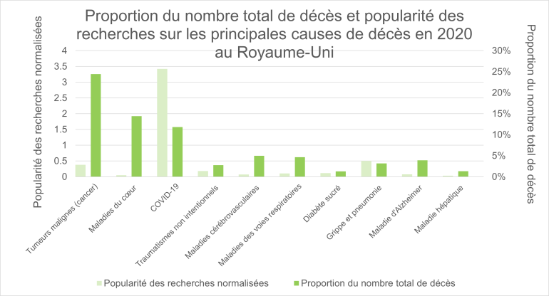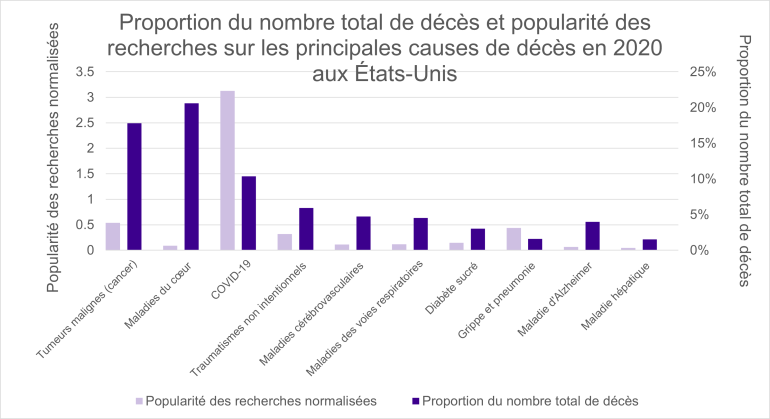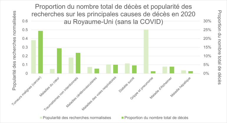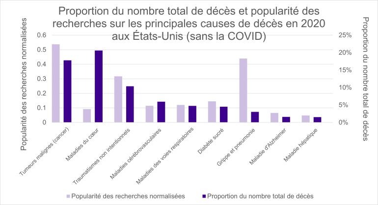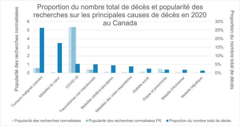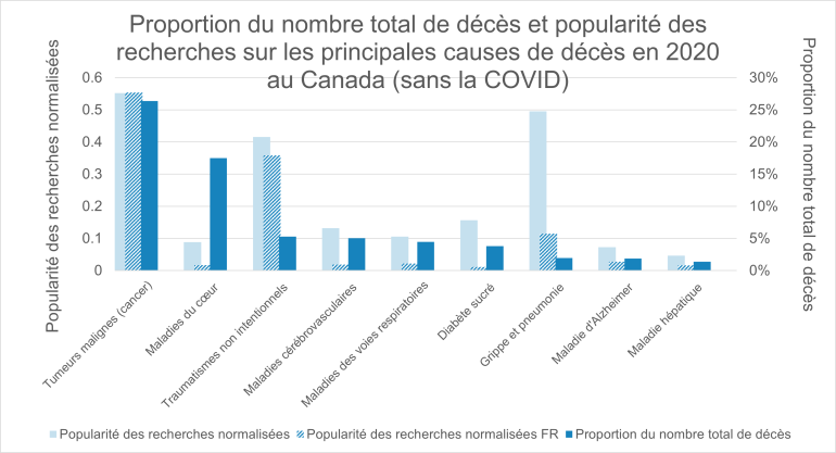 Le graphique ci-dessous montre la fréquence relative des principales causes de décès au Royaume-Uni, aux États-Unis et au Canada (axe des ordonnées à droite) par rapport à la fréquence relative des termes connexes recherchés sur Google (axe des ordonnées à gauche). Les barres hachurées en bleu montrent la fréquence relative des termes connexes en français au Canada. Les principales causes de décès sont indiquées sur l'axe des x et sont classées en ordre décroissant (en termes de proportion du nombre total de décès au Canada). Même sans l'impact de la COVID-19, cette comparaison fait apparaître un décalage évident.