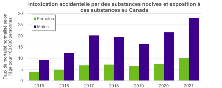 Le graphique ci-dessous montre l'évolution du taux de mortalité normalisé selon l'âge pour 100 000 personnes au Canada pour les décès classés dans la catégorie "Intoxication accidentelle par des substances nocives et exposition à ces substances", c'est-à-dire les décès qui incluent les décès accidentels liés aux opioïdes. Le graphique montre une augmentation générale des taux pour les hommes (barres mauves) et les femmes (barres vertes), les hommes connaissant généralement des taux plus de deux fois supérieurs à ceux des femmes.