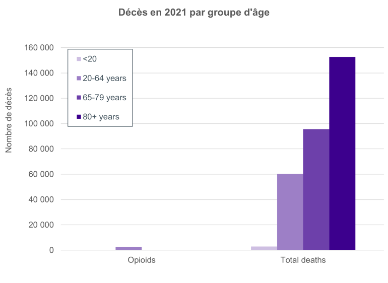 Le graphique ci-dessous montre le nombre de décès en 2021 par groupe d'âge, avec les décès liés aux opioïdes à gauche et tous les décès à droite. Il révèle que les décès liés aux opioïdes sont principalement concentrés dans le groupe d'âge actif (20-64 ans), et que les décès liés aux opioïdes représentent une faible proportion du total des décès au Canada (<0,5 %).