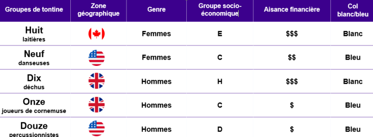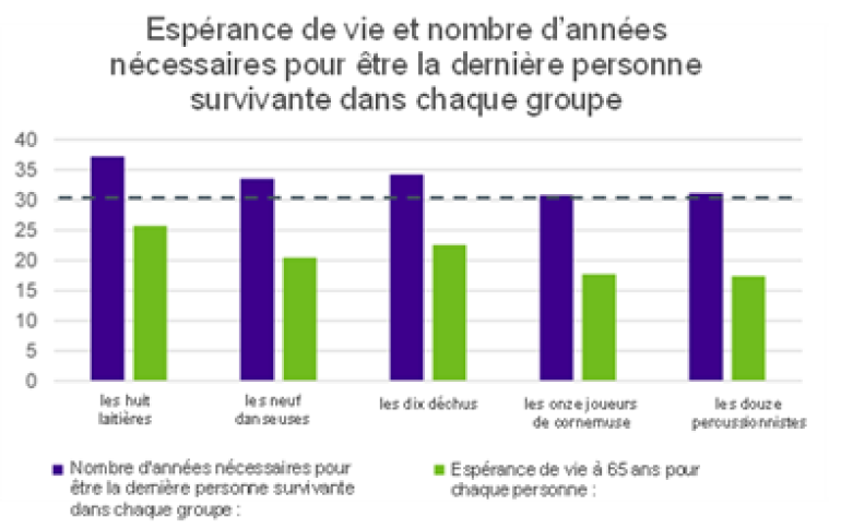 Si chaque groupe comptait le même nombre de personnes, la réponse serait aussi simple : le groupe à choisir serait celui comprenant les personnes dont l’espérance de vie est la plus courte. Pour les groupes de notre exemple, il y a plusieurs indicateurs sur leur durée de vie, notamment le genre, la zone géographique, le mode de vie et l’aisance financière. Si l’on s’attendait à ce que chaque groupe ait les mêmes variations, il suffirait de savoir qui sont les individus susceptibles de vivre le moins longtemps. Selon nos calculs, le groupe de percussionnistes avait la durée de vie la plus courte, bien que seulement 16 % de personnes ayant répondu au sondage aient choisi ce groupe.