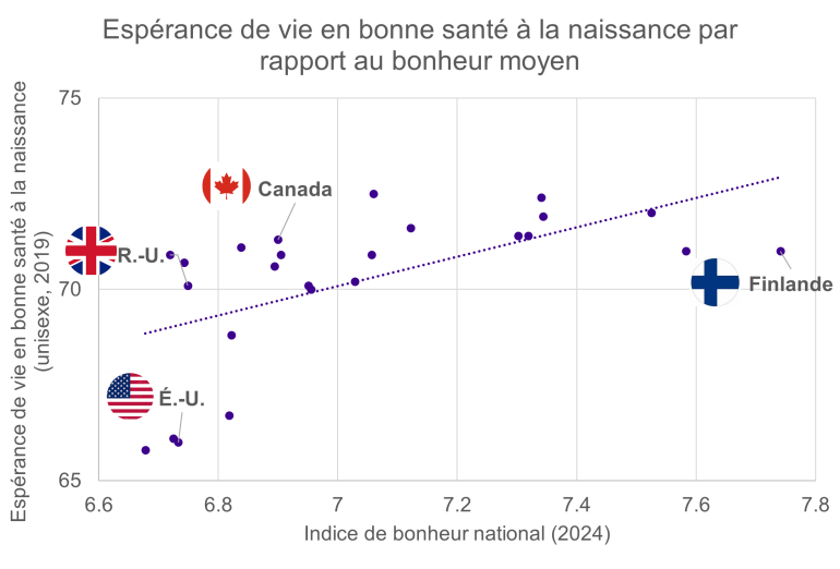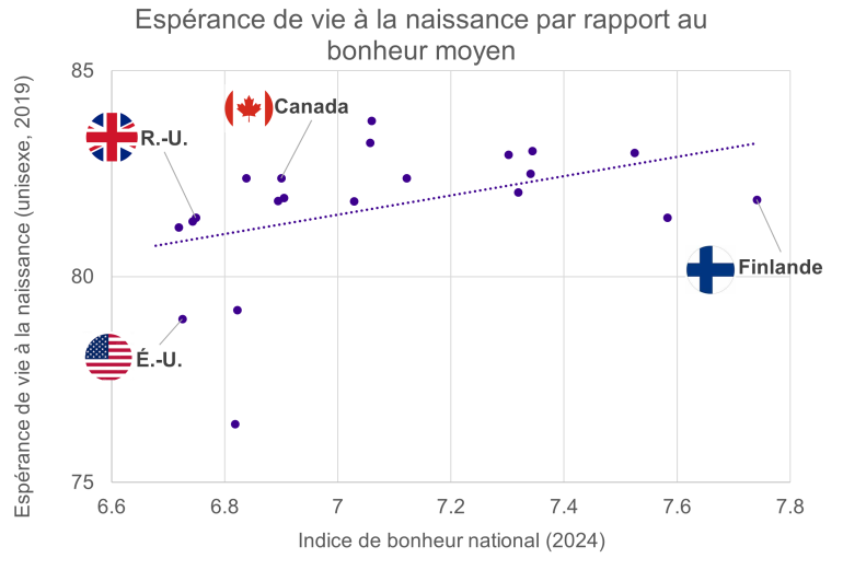 Comme toujours, il est très difficile d’établir un lien de causalité, mais les résultats du Rapport mondial sur le bonheur 2024 (site en anglais seulement) indiquent qu’il existe une certaine (quoique relativement faible) corrélation entre l’indice moyen de bonheur d’un pays et l’espérance de vie à la naissance de sa population.