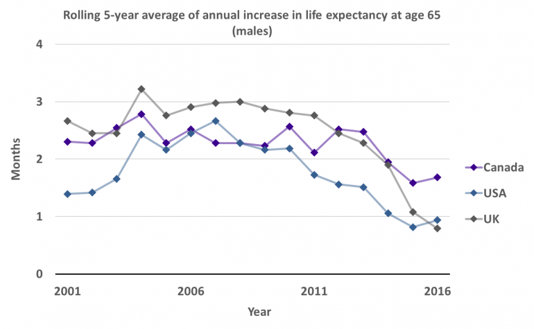 For Canadians, we observe a more modest slowdown over recent years, prior to which the average pace of improvements had been steadier, at almost two and a half months per year.