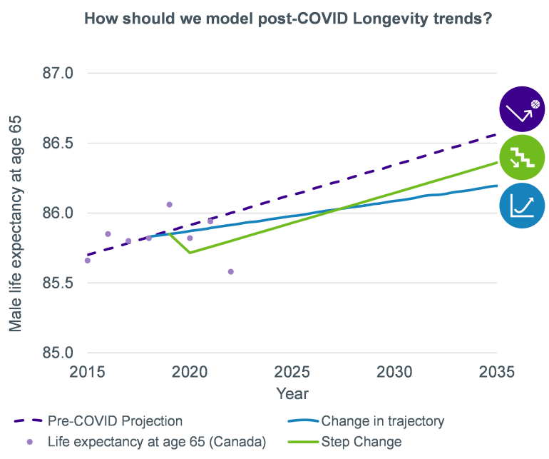 - Mortality assumptions are contingent on COVID outlook, whether COVID is perceived to have a transient impact, a short-term impact and/or a long-term impact, or even no impact at all. Adjustments to the baseline and/or improvement assumptions of a plan will be influenced by the expected future impact of COVID on longevity (“bounce back”, “step change”, “change in trajectory” or some combination).