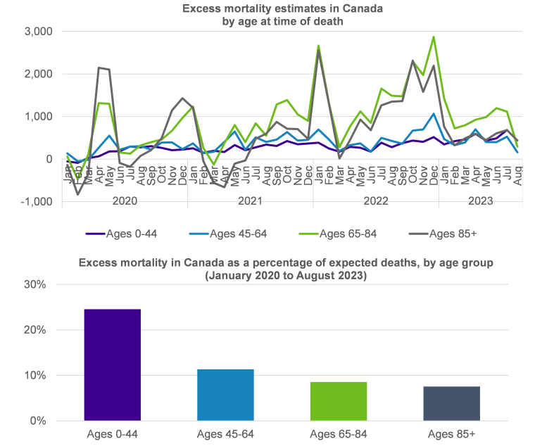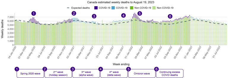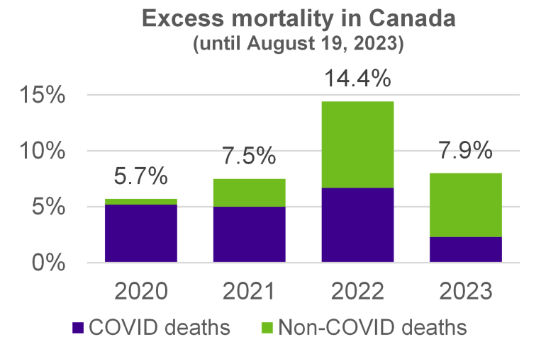Canadian excess deaths (based on pre-pandemic expectations) have been persistently elevated since the beginning of the pandemic, with the first wave hitting Canadians in March 2020. The chart below shows the estimated weekly deaths between January 2020 and August 2023 for the Canadian general population (we note that the timing and magnitude of the pandemic waves will also vary by geographic region of Canada). The dotted line depicts the deaths in those weeks that were expected before the pandemic, calculated and published by Statistics Canada based on 2016-2019 data. Excess deaths are all deaths above the expected deaths dotted line in the chart.