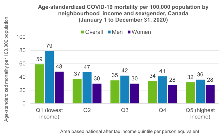 - The gender gap in COVID-19 mortality was higher in lowest-income areas (men-to-women ratio of 1.7 in Q1 vs 1.3 in Q5);