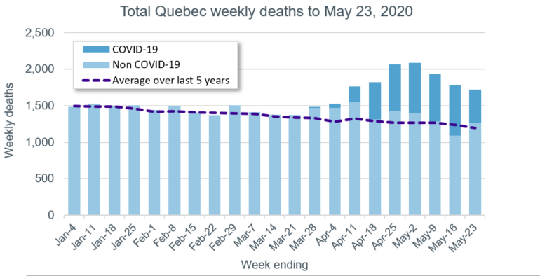 The answer is yes, but not necessarily for all provinces. And, the full extent isn’t currently known. We explored the same question in an article released in early May. At that time, there was a near total absence of data being released regarding the overall number of deaths in Canada so that the daily reported COVID-19 deaths could be put into context. However, even without this data, it seemed clear that the number of deaths had been elevated in Quebec and Ontario due to COVID-19.