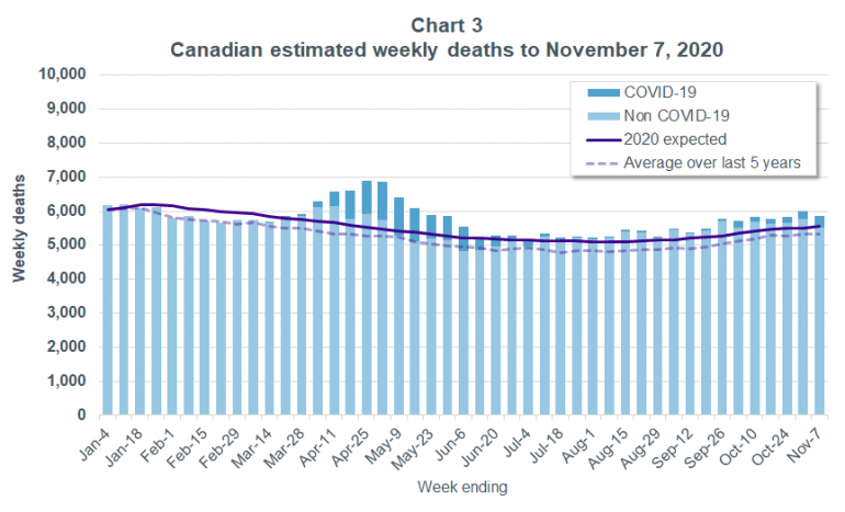 - Weekly deaths were below Statistics Canada’s expectations until early March, were then above expected through April and May (with the increase appearing to be largely attributable to COVID-19 deaths), and weekly deaths were around Statistics Canada’s expectation from June to August before moving somewhat higher than expected in September.