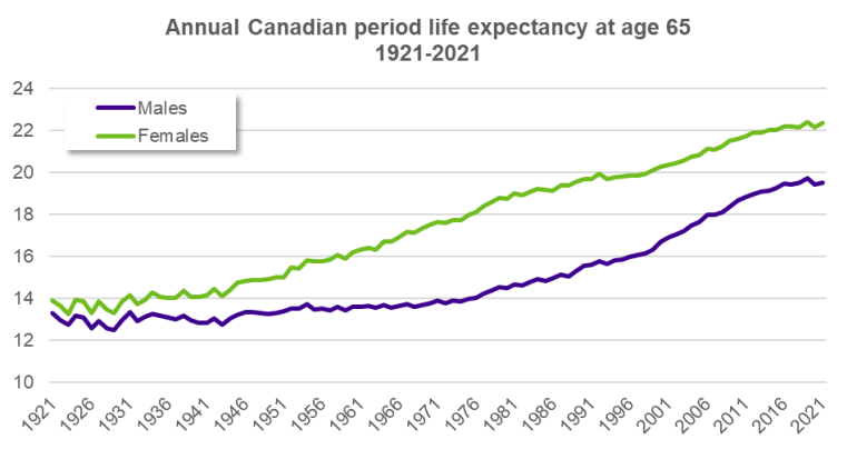 The chart below illustrates the annual Canadian period life expectancy at age 65 between 1921 and 2021 for both men (purple) and women (green). Although both men and women saw a rise in life expectancy over the span of 100 years, it's important to highlight that the rate, and sometimes timing, of this increase differed between men and women.
