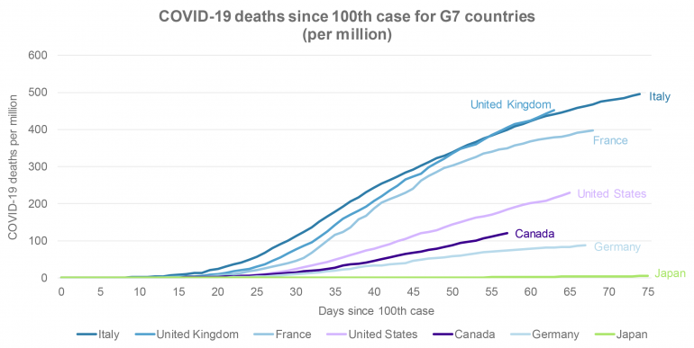 If we look purely at the number of COVID-19 deaths reported in Canada compared to that for other major developed countries, it appears that Canada’s experience with COVID-19 has not been as severe as many of our European peers and the US. This is illustrated by the chart below which shows the number of COVID-19 deaths (per million for each country to account for differences in population size) for G7 countries from the day since the 100th confirmed case for each country.