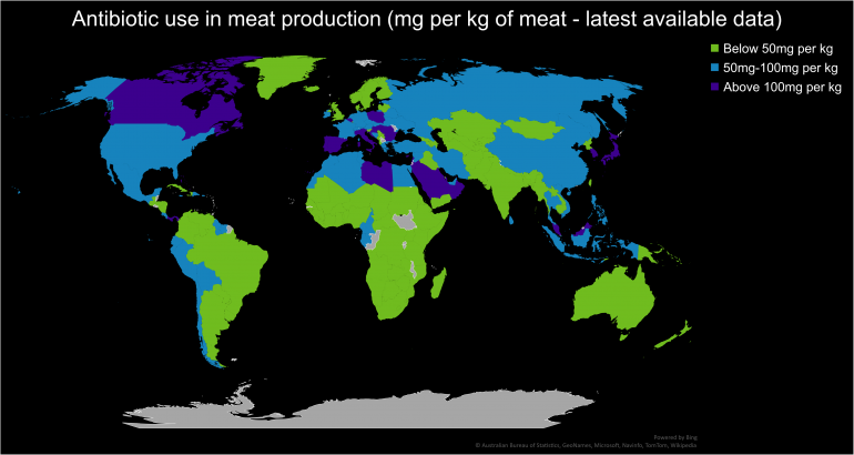 - There is a large variation in the amount of antibiotics used in meat production around the world.