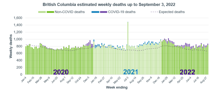 While it’s important to recognize that a portion of the excess deaths observed in British Columbia are due to increased drug related deaths observed during the pandemic1 this cause represents only a fraction of the observed excess deaths. The large spike in deaths observed in the summer of 2021, visible in both charts, is a result of record breaking heat in the BC interior during the last week of June, 2021.