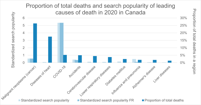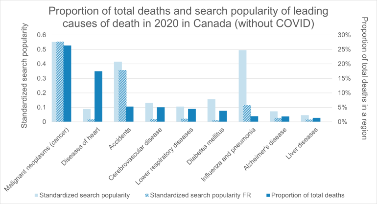 Besides the obvious boom in interest in COVID-19, the biggest difference between a leading cause of death and its search popularity was that for “diseases of the heart” which consistently ranked among the top 3 leading causes of death across all 3 regions but was among the lowest popular searches. Any discrepancies between search popularity and leading causes of death were amplified when querying French terms in Canada (especially since the more popular terms such as “coronavirus” and “cancer” are the same in both English and French).