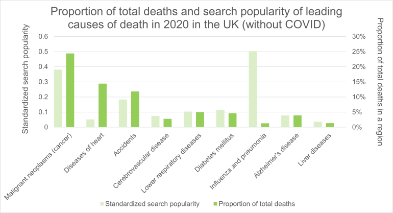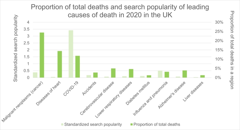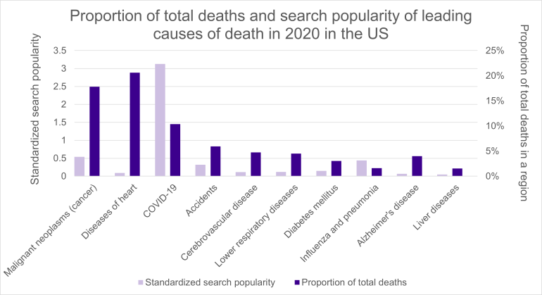 We used Google Trends to capture the relative interest in different search terms relating to the 10 leading causes of death in all 3 regions.