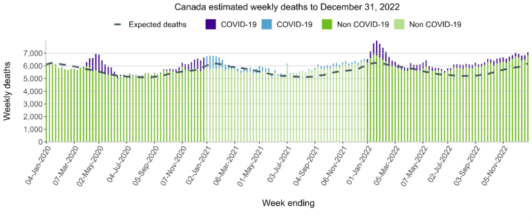 Canadian excess deaths (based on pre-pandemic expectations) have increased considerably since the beginning of 2022. While they were at 5.7% in 2020, 7.5% in 2021, excess deaths reached 13.5% in 2022; a far larger number than in the US (≈10% in 2022) and in England (≈6% in 2022)*. While the number of COVID deaths increased, so did the number of non-COVID related deaths.