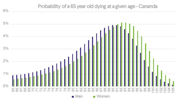 Over-reliance on life expectancy figures has the danger of over simplifying the challenges of financial planning for the future. Even if we ignore different factors that influence how long someone is expected to live, such as affluence, lifestyle and health, there is still a whole range of possible outcomes (shown below).