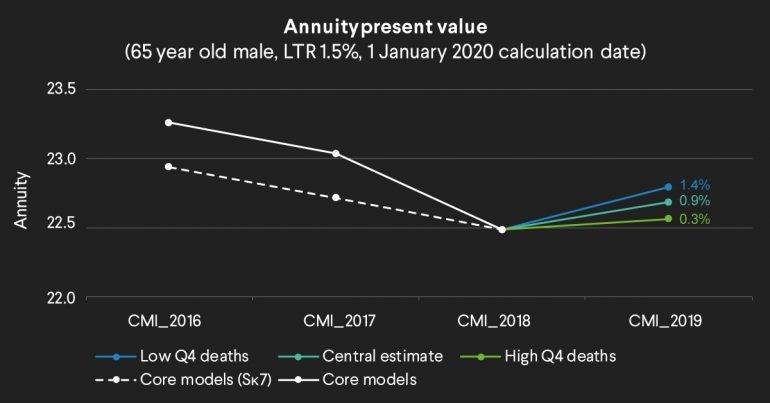 The mortality data for 2019 so far suggests that there will be at least some ‘bounce back’ to higher annuity values when updating the core CMI_2018 model for the upcoming core CMI_2019 model. Funds using the core model without adjustment will therefore be likely to see an increase in liabilities.