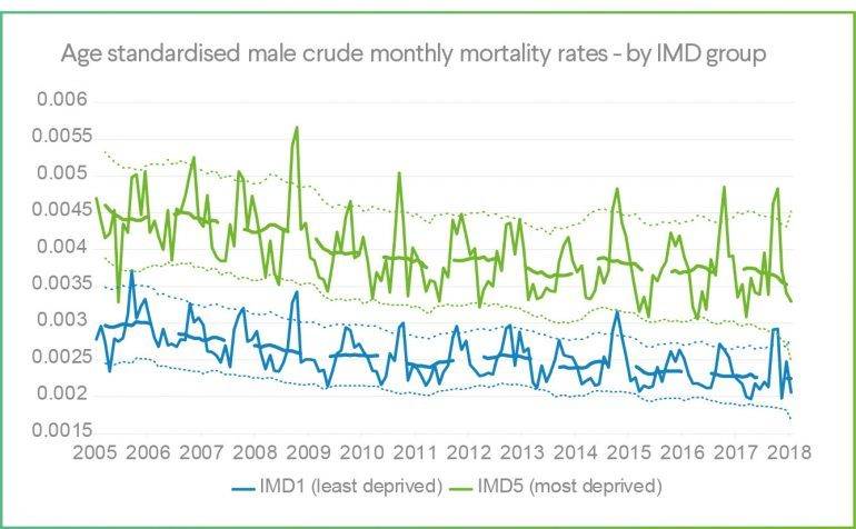 The chart below shows the progression of age standardised mortality rates for people living in the most deprived 20% and the least deprived 20% of the UK (measured by the Index of Multiple Deprivation).