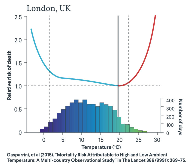 The graph below shows the relative risk of death at different temperatures, with the lowest point on the red and blue line showing that the optimum temperature for longevity in London is around 19.5 degrees Celsius. The bars display the actual incidence of these temperatures over a 14-year period, showing that in isolation rises in average temperatures would bring us closer to optimum levels.