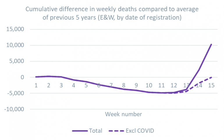 In the chart below we compare the cumulative weekly deaths in England & Wales to the corresponding 5-year average, and also show the equivalent cumulative deaths after removing the COVID related deaths (the dashed line).
