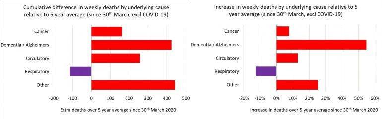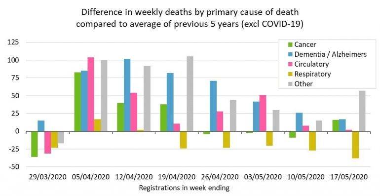Care is needed in drawing strong conclusions from these statistics. These relate to deaths where COVID-19 is not listed as the underlying cause of death i.e. the primary reason. Of the 1,177 excess deaths that have been registered since 29th March where COVID-19 is not listed as the primary cause, 178 of these mention COVID-19 on the death certificate as a contributory cause. (For those following our weekly blogs these are included in the “missing” deaths category.) However, this still leaves some 999 ‘extra’ deaths to date and we suspect that the analysis above offers a strong indication as to the likely primary causes of death[1].