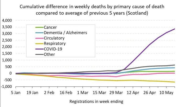One way to explore these missing deaths is to look at the primary cause of death listed on the death certificate. This is particularly easy to do for Scotland.