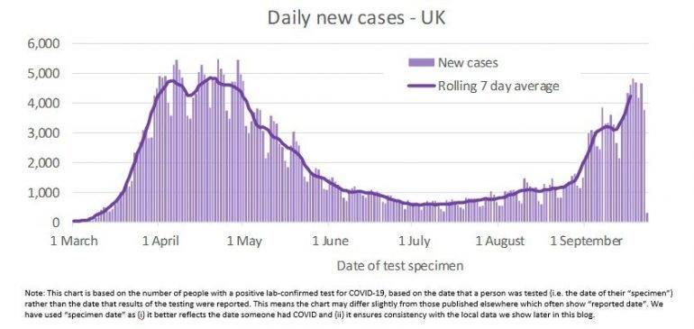 The chart below shows the latest case numbers published by the UK government (as at late evening on 24th September). The bars show the daily numbers of new COVID-19 cases across the UK, with the line showing the running seven-day average, smoothing through dips in new case numbers which tend to happen for example at weekends.