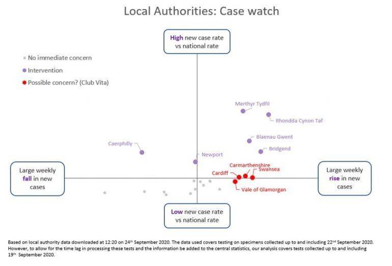 - Cardiff, Carmarthenshire, Swansea and Vale of Glamorgan all have high growth in new cases. Whilst the overall level of cases in these areas may not be of concern, if the growth in new cases continues, public health officials may view local lockdown as necessary in those area.