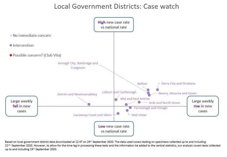 Our analysis of the daily case data for Northern Ireland, as published by the Department of Health, split by the 11 Local Government Districts is shown below.