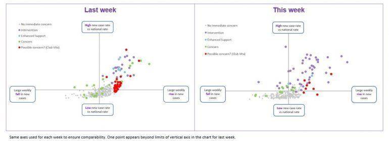The graphic below shows last week’s “case-watch” chart and this week’s chart side by side. We zoom in to this week’s chart later in this blog – the key thing for this chart is the location of the points on the chart, each of which is one of the (lower-tier) local authorities in England.