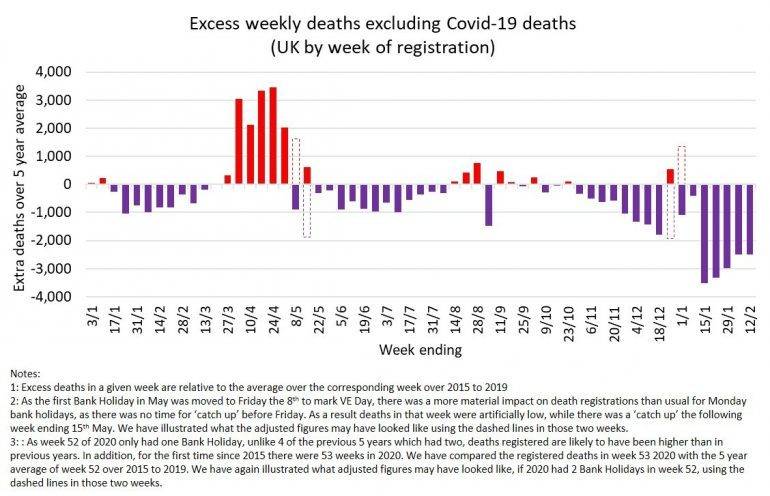 While the weeks around the turn of the year were impacted by variations in the timing of festive bank holidays, the latest week again saw non COVID-19 deaths that were significantly below expected levels. The extent to which the numbers were lower than average appears to be dropping steadily over the past few weeks, although care should be taken in interpreting these patterns over relatively short periods.