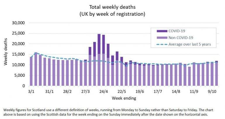 The latest statistics from the ONS include detailed breakdowns of deaths registered in England and Wales up to 16th October. In particular, they identify deaths where there is any mention of COVID-19 on the death certificate. Combining this information with similar data from the corresponding statistical bodies in Scotland and Northern Ireland, we can examine emerging patterns in the data.