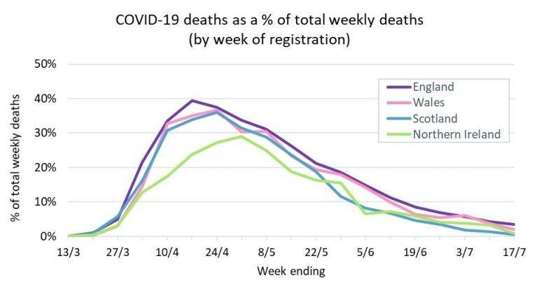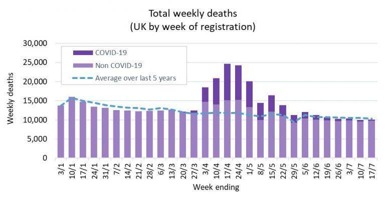 The latest statistics from the ONS include detailed breakdowns of deaths registered in England & Wales up to 17th July. In particular, they identify deaths where there is any mention of COVID-19 on the death certificate. Combining this information with similar data from the corresponding statistical bodies in Scotland and Northern Ireland, we can examine emerging patterns in the data.