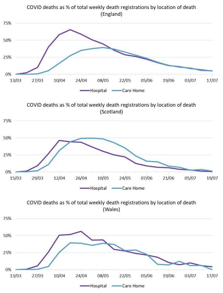 The charts below contrast the differing patterns over the last four months in the location of COVID-19 deaths in England, Scotland and Wales. Each chart shows, for hospitals and care homes separately, the proportion of total deaths registered each week where COVID-19 was mentioned on the death certificate.