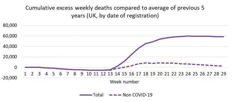 After a relatively light start to the year, and a subsequent jump as a result of the pandemic, the cumulative deaths in the UK over the first 29 weeks of the year appears to have stabilised for the moment at around 60,000 higher than the corresponding weekly average values over the past 5 years. Excluding those deaths which specifically mention COVID on the death certificate, we would be looking at an ‘average’ year, with cumulative deaths just slightly above average.