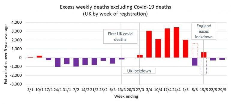 The light mauve bar in the chart above is the deaths which do not mention COVID-19 on the death certificate. These deaths have remained slightly below the average for the latest reported week.