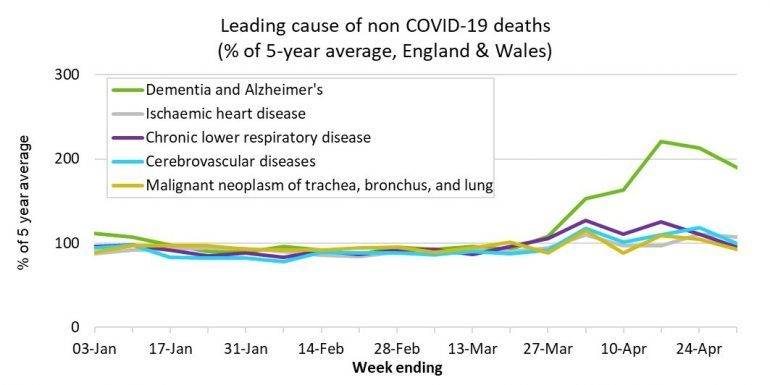 - Undiagnosed COVID-19: The ONS conclude this is likely contributory factor, especially given the challenges for Dementia/Alzheimer’s sufferers in communicating symptoms and the difficulty in diagnosing COVID-19 in the presence of multiple co-morbidities. (We are also aware of reports of atypical symptoms being expressed amongst care home residents.)