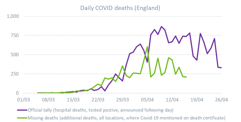 Alarmingly, these registrations show that as early as 17th April the Covid-19 death toll in England already exceeded the current official UK-wide total.