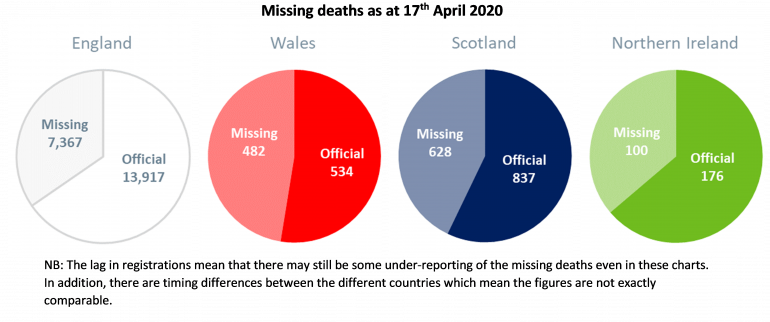 Focussing in on the 17th April (the end of the last week included in the ONS publication) we can look back to compare what we now know had happened in terms of deaths, with the official statistics published the following day. This provides an indication of the level of “missing” deaths for each of the home nations.