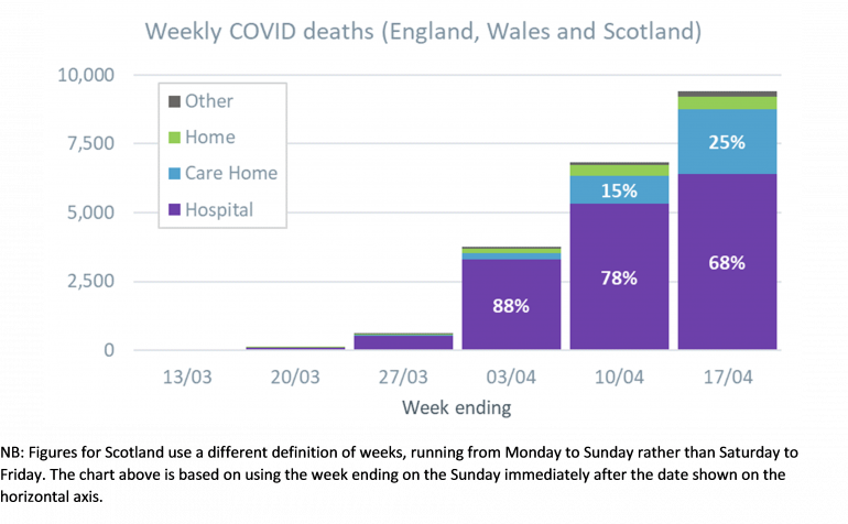 Data published today by the ONS (along with previous publications from the respective national statistical agencies of Scotland and Northern Ireland) casts some light. These latest statistics include Covid-19 deaths registered up to the 25th April, where there is a mention of Covid-19 somewhere on the death certificate, and includes both hospital and non-hospital deaths.