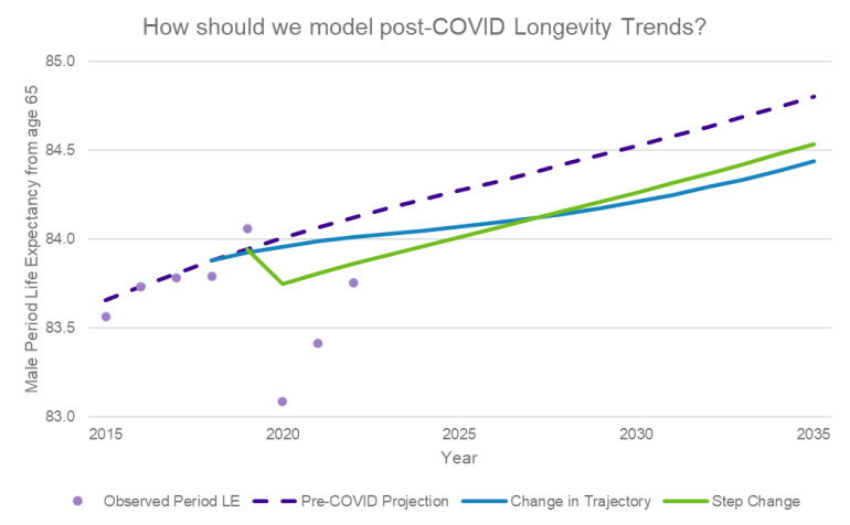 - Step Change – improvements in life expectancy post-COVID will be similar to pre-COVID expectations but from a lower starting point.