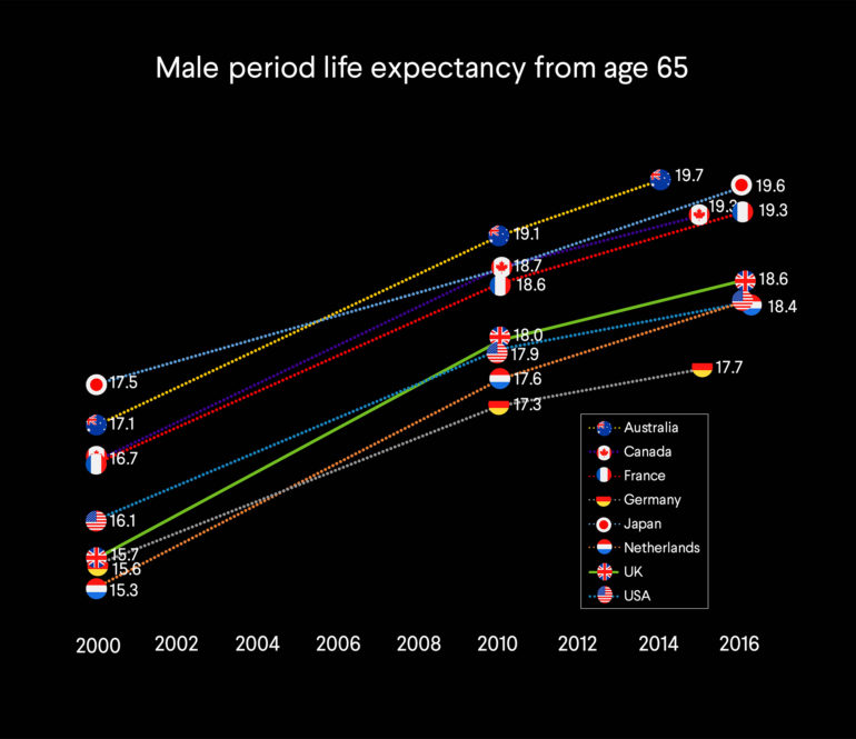 Life expectancy improvements for many countries seem to have declined in recent years, although on the whole life expectancy is still improving. We’ve looked at seven comparator countries: Australia, Canada, France, Germany, Japan the Netherlands and the USA.