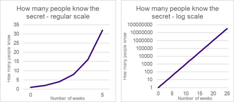 The two charts both map exponential growth. I have included iterations 1-5 on the first chart using a scale that shows this part of the growth well. If I was to plot 26 weeks on the same scale, the numbers would increase so much that the chart would actually need to reach the edge of the earth’s atmosphere.3 On the right I have used a log (based 10) scale. No trouble at all plotting 26 weeks there. This is the type of chart that has become so familiar to us when showing the increasing number of COVID-19 cases in various locations around the world.