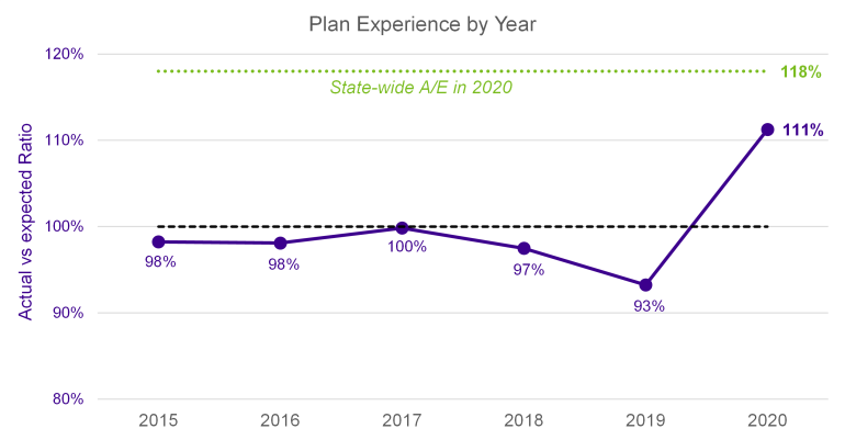 - The pension plan in the chart saw an A/E of 111% in 2020, a 13% increase from the Plan’s running average, but significantly lower than the state figures of 118% (where around 90% of retirees in the plan live).