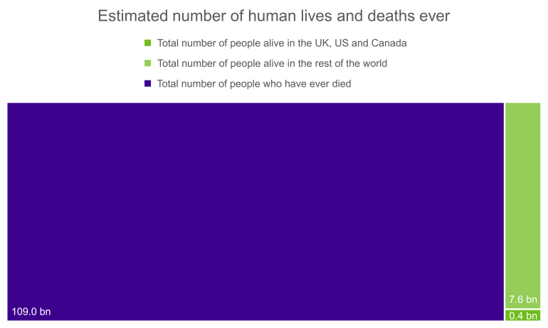 Sources: The total number of people to have lived in the past was estimated by Kaneda and Haub of the PRB as at November 15th 2022. The total populations for the world, the UK, US and Canada were taken from worldometers.info as at November 15th 2022