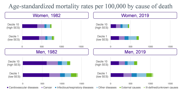 - The gap in mortality rates between high and low socio-economic groups has widened over time, i.e., improvements have been greater for higher socio-economic groups. Interestingly, this dynamic has resulted in high SES men now living longer than low SES women.