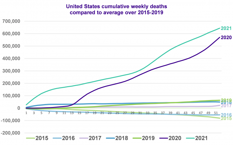 The chart below shows the cumulative weekly deaths in the US for each year from 2015, relative to the average over 2015 to 2019. Note that the aging US population means we would expect the number of deaths to increase slightly each year, all else being equal.